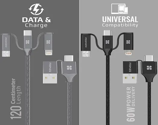 6-in-1 Hybrid Multi-Connector Cable for Charging & Data Transfer • 60W Power Delivery USB-C to USB-C • Micro-USB • USB-C • Lightning connector Black
