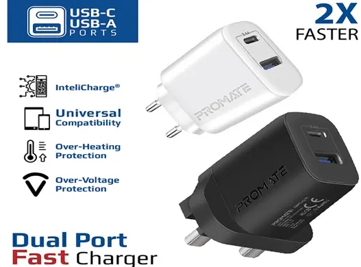 17W High-Speed Dual Port Charger • Dual Output Ports • Automatic Voltage Regulation • Over-charging & short-circuit protection Black