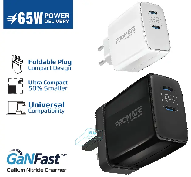 65W Super Speed GaNFast® Charging Adapter with Dual USB Ports • 50% Smaller & Lighter • Dual USB-C Device Charging