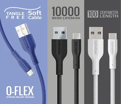 Super-Flexible USB-A to USB-C Cable • 2A Standard Charging • 10000+ Bend Lifespan • 1 Meter Length Black
