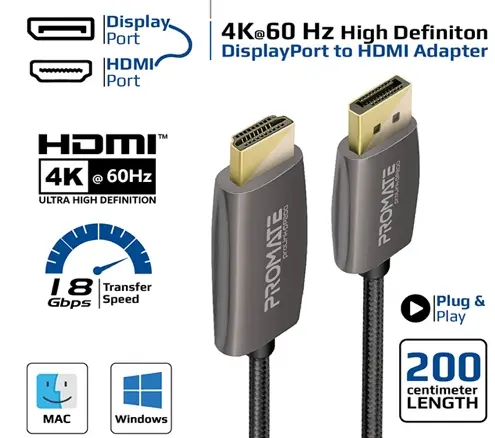4K@60Hz High-Definition DisplayPort to HDMI Cable • Corrosion Resistant Connectors • Uni-Directional Converter • Superior Stability • 2m Cable Length