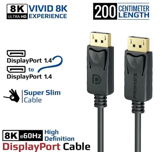 8K@ 60Hz High-Definition DisplayPort Cable • DisplayPort 1.4 • 32.4Gbps Bandwidth • Dynamic HDR • Secure Clip Lock • 2m Length