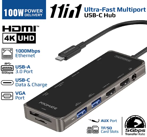 11-in-1 USB-C Hub with 100W Power Delivery • 4K HDMI • 1080p VGA • Dual Display Support • 1000Mbps LAN • USB 3.0 & USB 2.0 Ports • AUX • SD/TF Card