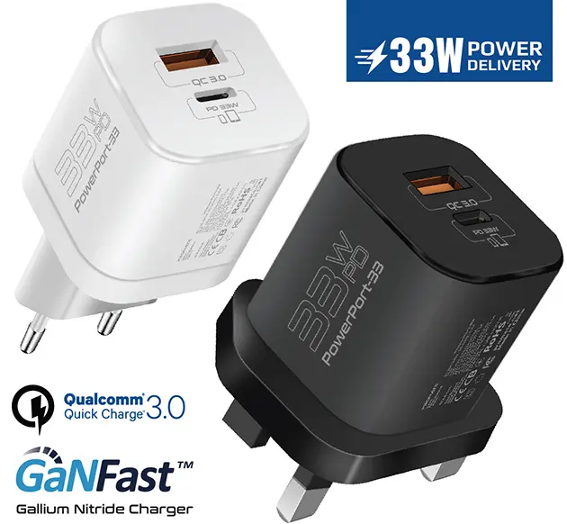 33W Power Delivery GaNFast™ Charging Adapter • 33W Power Delivery • Qualcomm Quick Charge 3.0 • Surge Protection • Automatic Voltage Regulation