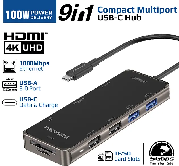 Compact 9-in-1 Multiport USB-C Hub with 100W Power Delivery • 4K HDMI • 1000Mbps LAN • USB 3.0 & USB 2.0 Ports • SD/TF Card • Plug & Play