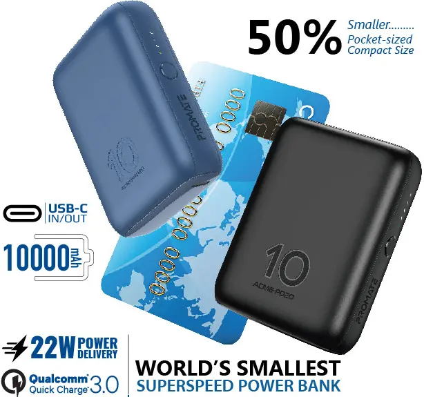 10000mAh Ultra-Mini PowerBank • 20W Power Delivery • Quick Charge 3.0 • 18W Super-Fast Charging Input • Palm Sized Super Mini Design
