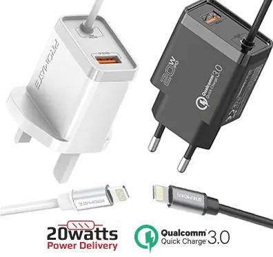 Quick Charging Wall Charger with Lightning Cable • 20W Lightning Power Delivery • Qualcomm Quick Charge 3.0 Port • 1.5m Charging Cable