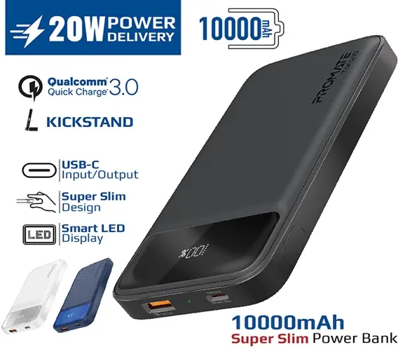 10000mAh Super-Slim Power Bank with Dual USB Output • 20W USB-C Fast Charging • 18W Quick Cahrge 3.0 • Auto-Voltage Regulation