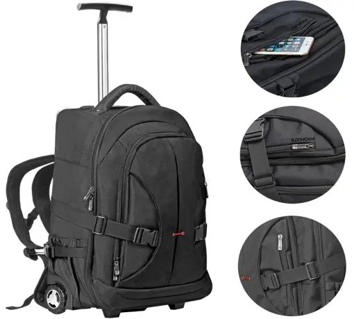 Large Capacity Trolley Bag with Multiple Compartments for 15.6” Laptops • BackPack • Water Resistant • Padded Laptop & Tablet Pocket • High Volume Storage • Durable Wheels • Lightweight
