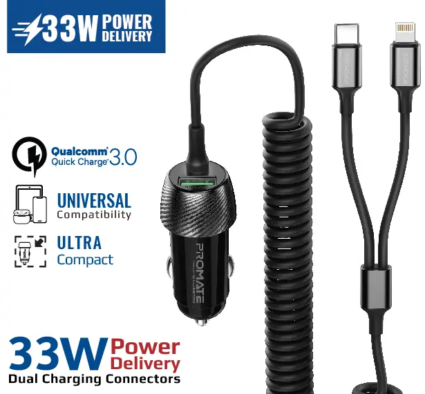 33W Car Charger with Lightning Connector & USB-C Cable • 30W USB-C Power Delivery • 20W Lightning Power Delivery • Quick Charge 3.0 for Smartphones