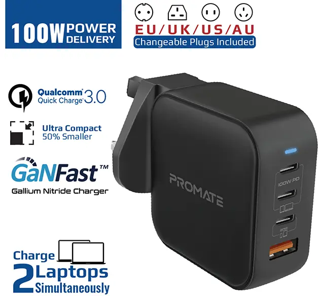 100W Power Delivery GaNFast™ Charger with Quick Charge 3.0 • 100W Power Delivery • Qualcomm Quick Charge 3.0 • 4 Devices Simultaneous Charging