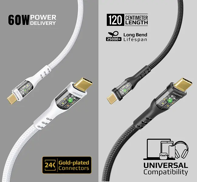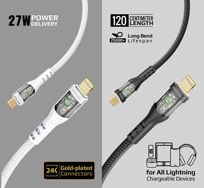 27W Power Delivery USB-C to Lightning Cable with Transparent Shells • Data & Charge Support • LED Light • 1.2m Length • 25000+ Bend Lifespan • Gold plated Connector