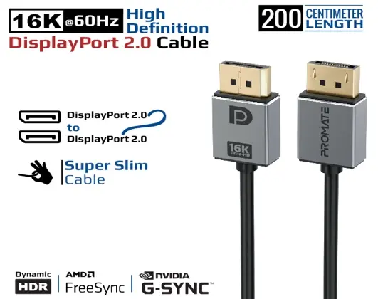 16K@60Hz High-Definition DisplayPort Cable • DisplayPort 2.0 • 80Gbps Bandwidth • Dynamic HDR Compliant • Secure Clip Lock • 2m Length
