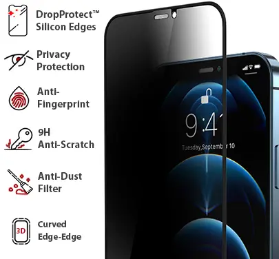 iPhone 14PLUS DropProtect™ Clear Privacy 3D Glass with Built-in Bumper • Privacy Protection • Superior Clarity • 9H Hardness • Anti-Dust Filter
