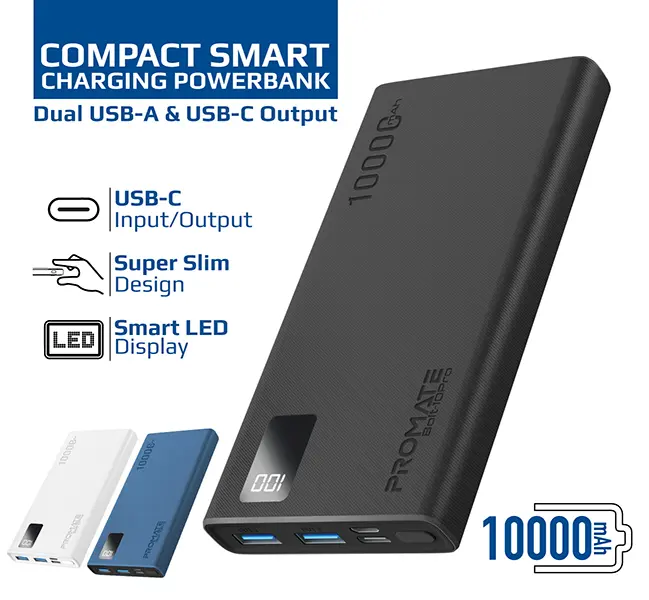 10000mAh Super-Slim Power Bank with Dual USB Output • 20W USB-C Fast Charging • 18W Quick Cahrge 3.0 • Auto-Voltage Regulation