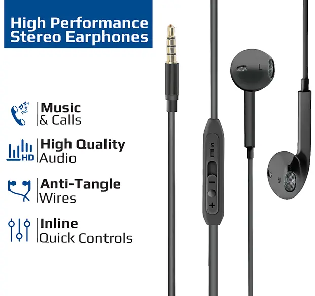 Lightweight High-Performance Stereo Earbuds • Universal Volume Control • Inline Microphone • Anti-Tangle Flat Cable