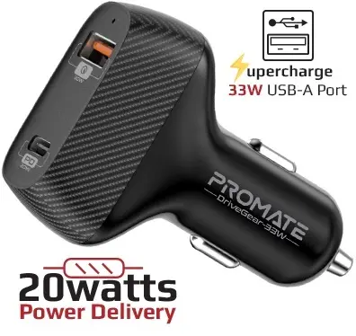 33W Car Charger with 20W USB-C Port & 33W USB-A Port • 20W Fast Charging Power Delivery for iPhone 12&13 • Qualcomm Quick Charge 3.0 for All Androids